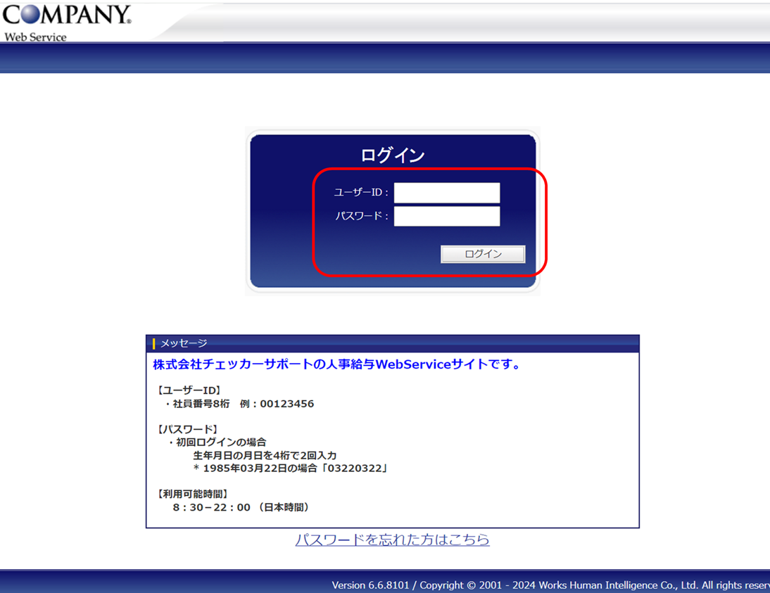 COMPANY Web Service 利用可能時間は 8:30~22:00 です