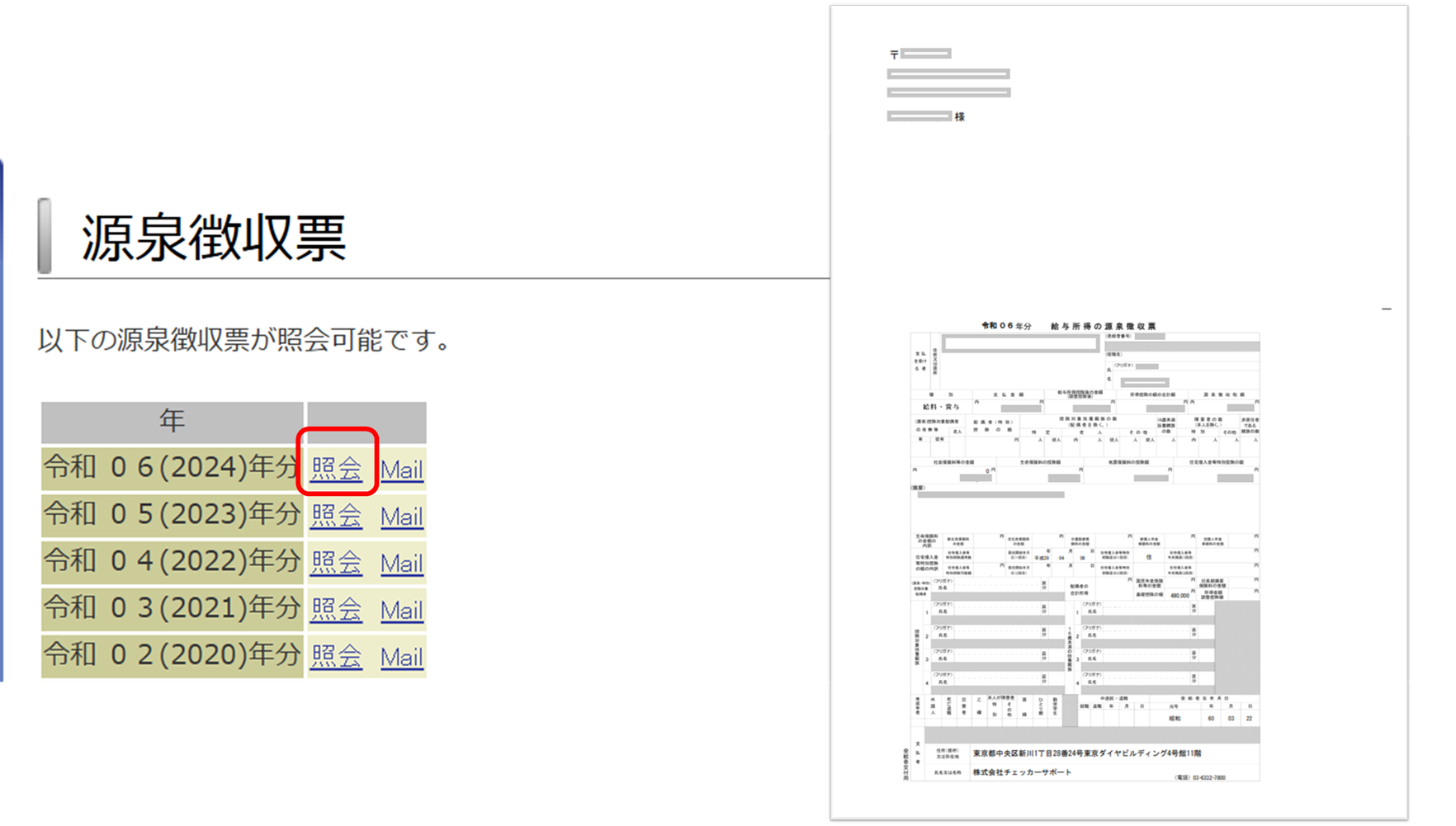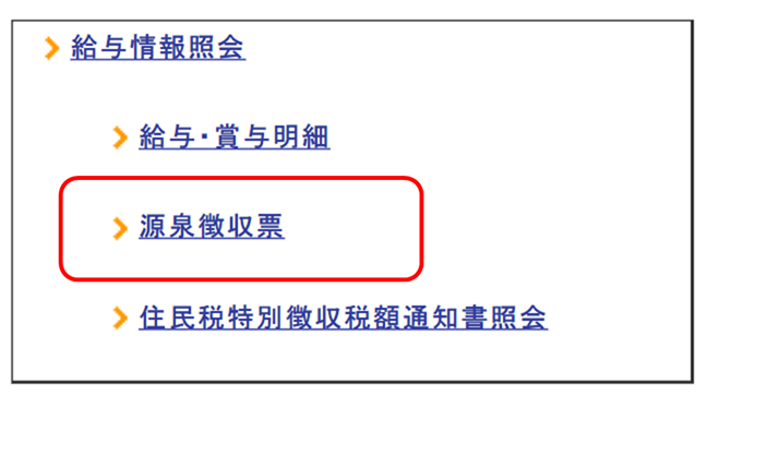 ② サービスメニューの中の、給与情報照会の下にある「源泉徴収票」を開きます。