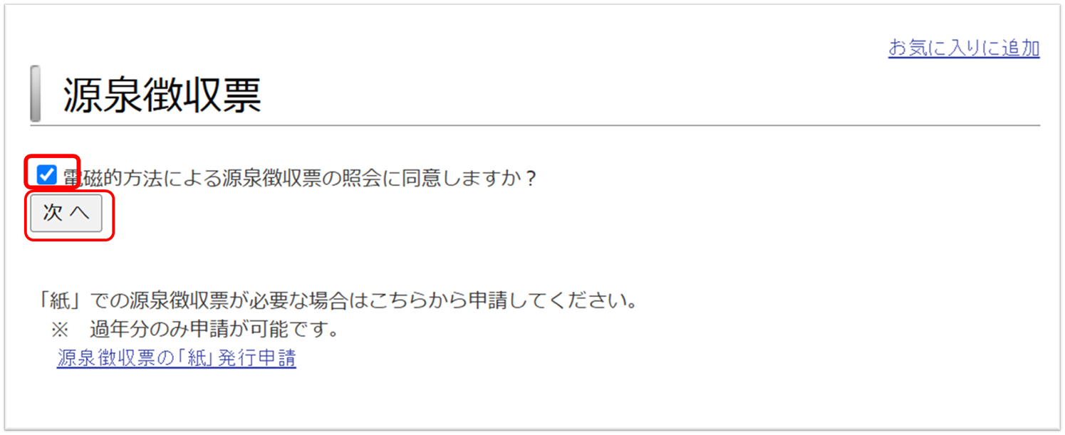 ③ 電磁的方法による源泉徴収票の照会に同意しますか?にチェックを入れ、「次へ」をクリックします。
