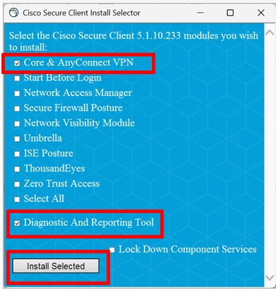 ③ “Core&AnyConnectVPN”と”Diagnostic And Reporting Tool”にチェックを入れ、他の項目はチェックを全て外してください。
