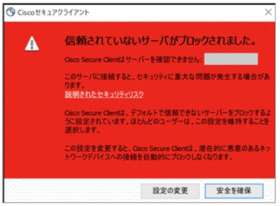 ③ 「信頼されていないサーバーがブロックされました」の表示が出たら、「設定の変更」をクリックします。