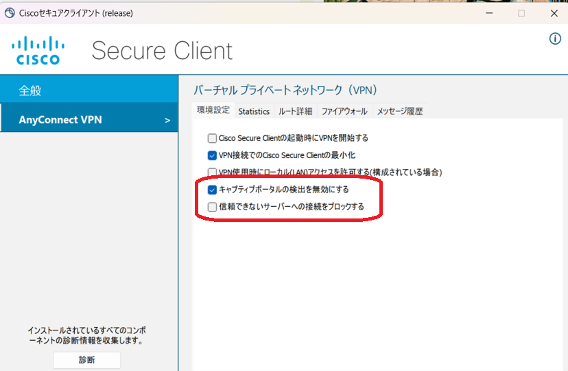 • Cisco Secure Clientをインストールまたは更新した時期とOSバージョンの組み合わせによっては、SSL-VPN接続が出来ない可能性があります。