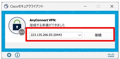 ② 接続先に「223.135.206.55:20443」を入力し、”接続/connect”をクリックします。