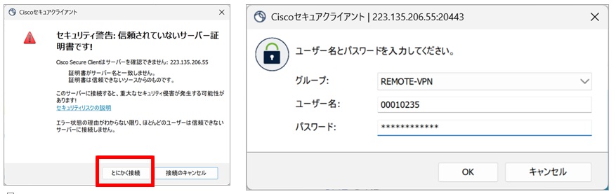 • Cisco Secure Clientでは、セキュリティ上パスワードを端末に保存することができません。
