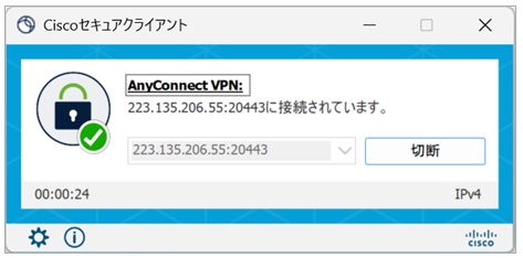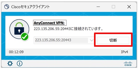 ① 「Cisco Secure Client」を起動し、切断をクリックします。