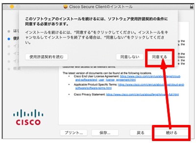 ⑤ 使用許諾画面が表示されるので、「続ける」をクリックした後、使用許諾画面で「同意する」を選択します。