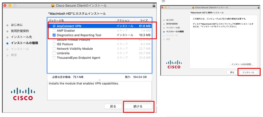⑥ インストールの種類は「AnyConnect VPN」と「Diagnostics and Reporting Tool」を選択して、「続ける」から「インストール」をクリックします。