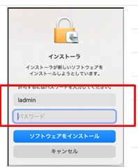 ⑦ macOSの管理者ユーザーID・PWを入力し、「ソフトウェアをインストール」をクリックします。