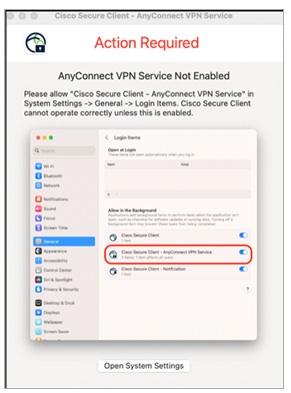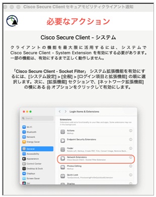 ⑬ 「Cisco Secure Client – System Extensionを有効にする必要があります」という表示が出た場合は、無視をして左上の「×」を押してください。