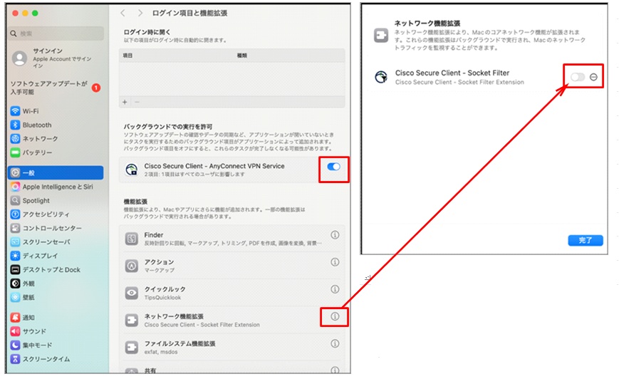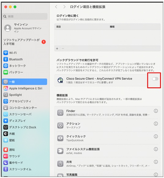 ⑭ [Appleマーク > システム設定 > 一般 > ログイン項目と機能拡張]を開いたときに「Cisco Secure Client – AnyConnect VPN Service」が有効、「ネットワーク機能拡張」が無効になっていることを確認してください。