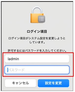 ⑩ 下記画面が表示されますのでmacOSの管理者ユーザーID・PWを入力し、「設定を変更」をクリックします。