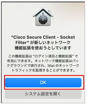 ⑪ 「Cisco Secure Client – Socket Filterが新しいネットワーク機能拡張を使おうとしています」という画面が表示された場合、「OK」をクリックします。