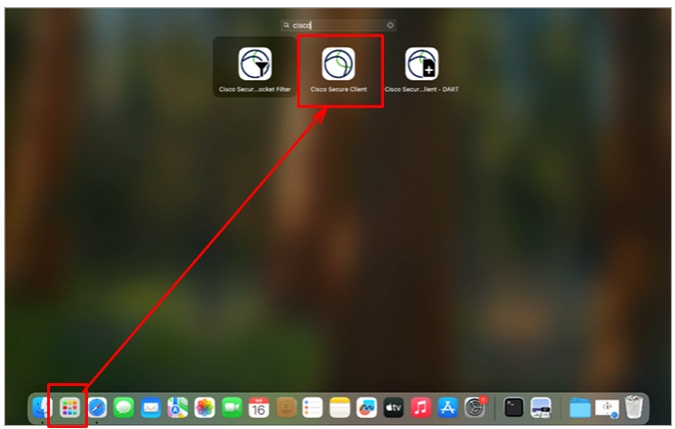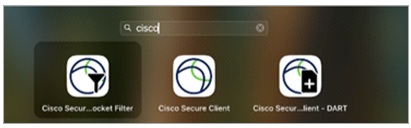 ① Launchpadを開き検索画面から「cisco」と入力して、Cisco Secure Clientを起動します。
