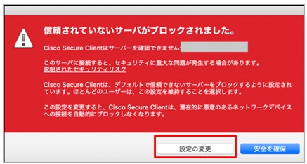 ③ 「信頼されていないサーバーがブロックされました」の表示が出た場合、「設定の変更」をクリックします。