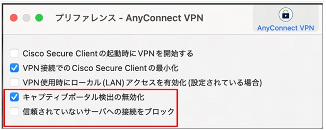 ④ 「プリファレンス/Preferences」から「信頼されていないサーバーへの接続をブロック」のチェックを外します。「キャプティブポータルの無効化」にはチェックを付けます。
