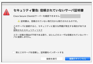 • Cisco Secure Clientをインストールまたは更新した時期とOSバージョンの組み合わせによっては、SSL-VPN接続が出来ない可能性があります。