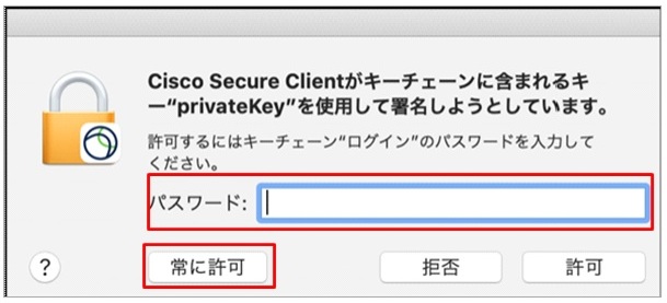 ⑧ クライアント証明書認証をしている場合、下記の画面が表示されることがあります。macOSの管理者パスワードを入力し、「常に許可」をクリックします。