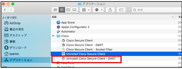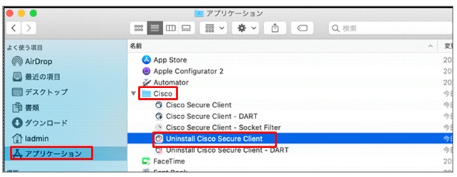 ⑥ Finderを開き、[アプリケーションか-Ciscoフォルダ]の中に「Cisco Secure Client」「Cisco Secure Client – DART」が存在しないことを確認します。